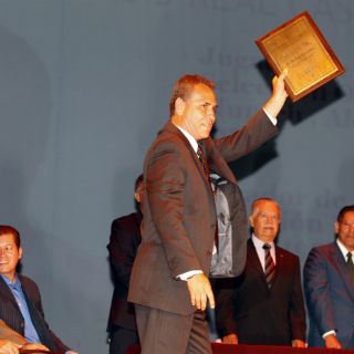 Real, con traje oscuro, lució contento, mientras demás personajes recibían su reconocimiento, el "Güero" observó a detalle lo que decía su placa.