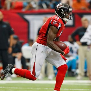 Una semana después de haber sido frenado con una sola recepción en una victoria en Nueva Orleáns, Jones atrapó un pase de 75 yardas cerca del final mientras Atlanta consolidaba su liderato en la División Sur de la Conferencia Nacional.