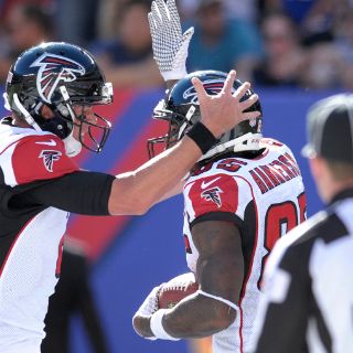 RUTHERFORD, NUEVA JERSET (20/SEP/2015).- Julio Jones atrapó un pase perfecto 37 yardas de Matt Ryan y dejó todo listo para que Devonta Freeman llevara la pelota a la zona de anotación de Gigantes con 1.14 minutos restantes de juego y llevar a los