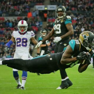LONDRES, INGLATERRA (25/OCT/2015).- El receptor abierto Allen Hurns capturó un pase de 31 yardas de anotación que le mandó el mariscal de campo Blake Bortles a falta de menos de tres minutos para el final del tiempo reglamentario y los