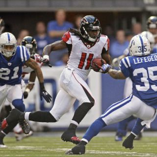 INDIANAPOLIS, INDIANA (06/NOV/2011).- Julio Jones atrapó pases de touchdown de 50 y 80 para que los Halcones de Atlanta derrotasen el domingo 31-7 a los Potros de Indianápolis, que siguen sin conocer la victoria en la temporada.