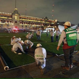 La mañana de hoy jueves, el Zócalo amaneció de verde, donde trabajadores instalaban el pasto y algunas carpas.