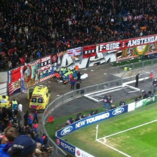 AMSTERDAM, HOLANDA (27/NOV/2013).- La caída de un aficionado desde las gradas del Amsterdam Arena durante el partido Ajax-