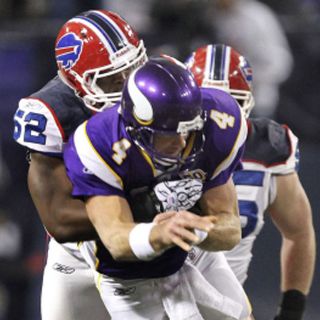 Favre resultó lesionado del hombro en la primera serie del partido, después de recibir un fuerte golpe del jugador de línea de los Bills, Arthur Moats.