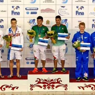 > Oro en el Campeonato Mundial Juvenil de Clavados desde el trampolín 3 metros sincronizados, al lado de Rodrigo Diego, Penza, Rusia, septiembre 2014