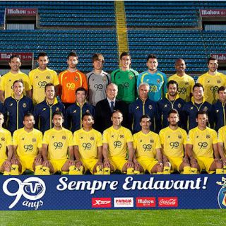 VILLARREAL, ESPAÑA (12/MAR/2013).- La celebración por los 90 años del 'Submarino Amarillo' se plasmó en una fotografía en la que ya aparece el mexicano Javier Aquino, recién llegado como refuerzo y que ya es considerado en el cuadro titular por el cuerpo técnico encabezado por Marcelino García Toral.