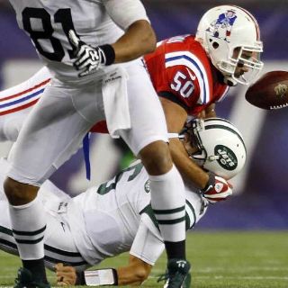 FOXBOROUGH, MASSACHUSETTS (21/OCT/2012).- Rob Ninkovich recuperó un balón suelto de Mark Sánchez, luego de que Stephen Gostkowski consiguiera un gol de campo de 48 yardas en tiempo extra, y los Patriots de Nueva Inglaterra vencieron el domingo por 29-26 a los Jets de Nueva York.