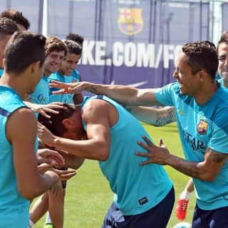 Durante el entrenamiento realizado en el campo 1 de la Ciudad Deportiva de Barcelona, el español Xavi Hernández y el brasileño Dani Alves, continuaron con su trabajo específico de recuperación.