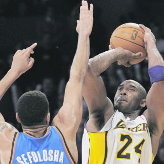 El escolta Kobe Bryant y el español Pau Gasol fueron los pilares en los que se apoyaron los Lakers de Los Ángeles para imponerse, tras una doble prórroga, por 114-106 al Thunder de Oklahoma City.