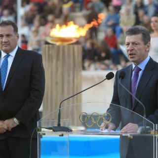 Las mismas actrices, vestidas como sacerdotisas, que encendieron la llama el domingo en la Olimpia Antigua, prendieron una antorcha con un pebetero colocado dentro del Estadio Panathinaiko en Atenas. La llama fue entregada al viceprimer ministro ruso, Dmitry Kozak.
