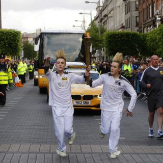 Con el Comité Organizador de los Juegos (LOCOG) presente, encabezado por su presidente, Sebastian Coe, el boxeador de Belfast Michael Carruth y el púgil dublinés Wayne McCullough, ambos medallistas olímpicos, se intercambiaron la antorcha.