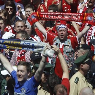Tímidamente, grupos de aficionados del Chelsea contemplaban el espectáculo y participaban en el ritual de los brindis, conscientes de ser minoría, pero en aparente buena sintonía con los aficionados locales, pese a la rivalidad histórica entre el fútbol alemán y el inglés.