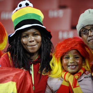 JOHANNESBURGO, SUDÁFRICA (03/JUL/2010).- Los aficionados al futbol sudafricanos siguen disfrutando su Mundial y ante la falta de sus queridos 'Bafana Bafana' y tras la eliminación de las estrellas negras de Ghana, decidieron ponerse la camiseta de la Selección de España y con su presencia en el Estadio Ellis Park de Johannesburgo, tiñeron de rojo y amarillo el graderío, que nuevamente registró otro lleno.