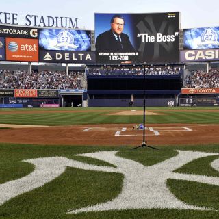 Mientras los aficionados se pusieron de pie para escuchar un clarín que llamaba a tributo fúnebre, y luego de dos minutos de silencio, las 27 banderas de campeones mundiales, que el dueño del equipo George Steinbrenner amara con todo su corazón, ondeaban con fuerza a media asta hacia el jardín central y en medio de un potente viento.
