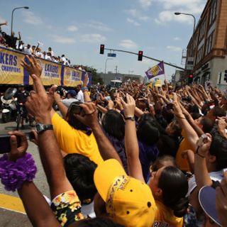 “We love L.A." (amamos Los Ángeles), "Back2Back without Shaq” (dos títulos seguidos sin ‘Shaq, en alusión al pívot Shaquille O'Neal), "3Peat" (tres títulos seguidos) o "This is Kobe's Town” (éste es el pueblo de Kobe), fueron algunos de los mensajes en carteles que se podían leer entre la muchedumbre que asistió a vitorear a sus héroes.