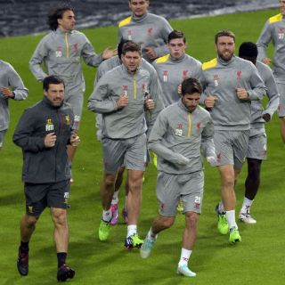 Con una indumentaria gris con detalles amarillos en los hombros, los jugadores del Liverpool encabezados por el capitán Steven Gerrard, calentaron con una carrera continua antes de completar una sesión con balón para afinar puntería.