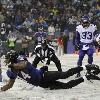 Marlon Brown cuando faltaban cuatro segundos para que terminara el juego con lo que los Cuervos se impusieron 29-26 el domingo a los Vikingos en una batalla ofensiva disputada en un campo congelado.