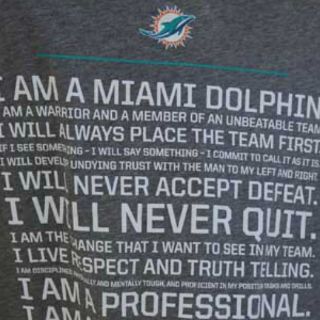 Uno por uno, todos los integrantes del ataque y defensa del equipo se quitaron las protecciones para hombros el miércoles para ponerse una camiseta gris. En la parte trasera tienen impresa una lista de 10 frases y en los bordes aparece la oración "Soy un Delfín de Miami" con el que muestran cómo pretenden encarar la próxima campaña.