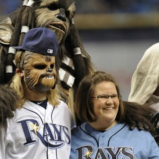 En esta ocasión, la mujer apareció en el juego de Grandes Ligas entre Las Mantarrayas de Tampa Bay y los Astros de Houston lanzado la primera bola del partido acampañada de un wookiee.