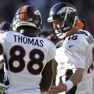 Con el entrenador interino Jack del Río a cargo, Manning mantuvo a los Broncos (8-1) a todo galope. Lanzó pases de anotación de 11, 7 y 34 yardas a Thomas en ofensivas consecutivas entre el segundo y el tercer cuarto.