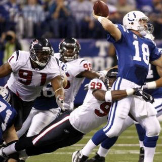 El cuatro veces Jugador Más Valioso lanzó para dos touchdowns, y luego vio a Mike Hart correr por primera vez 84 yardas y a Jacob Tamme anotar el primer touchdown de su trayectoria para guiar a los Potros de Indianápolis al triunfo por 30-17 sobre los Texanos de Houston.