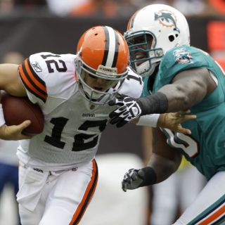 CLEVELAND, OHIO (25/SEP/2011).- Colt McCoy se guardó lo mejor para el final el domingo al lanzar un pase de touchdown de 14 yardas a Mohamed Massaquoi cuando restaban 43 segundos tras una marcha de 80 yardas y los Cafés de Cleveland vencieron 17-16 a los Delfines de Miami.