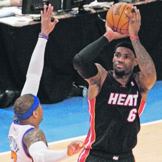 LeBron James anotó 32 puntos, entre ellos ocho seguidos al comenzar el último periodo, y el Heat de Miami sacó una ventaja de 3-0 sobre los Knicks al vencerlos anoche 87-70 y propinarle a Nueva York su decimotercera derrota seguida en postemporada.