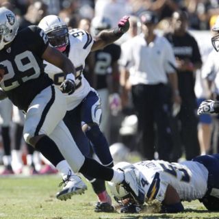 OAKLAND, CALIFORNIA (11/OCT/2010).- Michael Bush corrió tres yardas para registrar la anotación del triunfo cuando quedaban 3:39 minutos de juego, luego Tyvon Branch realizó un regreso de balón suelto de 64 yardas para touchdown y los Raiders de Oakland ganaron 35-27 el domingo a los Cargadores de San Diego.