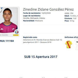 GUADALAJARA, JALISCO (25/JUL/2017).- El cuadro mexicano de Monarcas Morelia presume de tener en su cantera a un jugador de nombre curioso. Se trata de Zinedine Zidane González Pérez, quien milita en las categorías inferiores, más claramente en el equipo Sub-15.