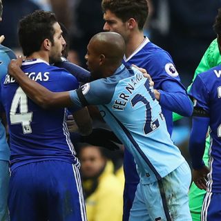La trifulca se desató en el minuto 95 del encuentro con el marcador 3-1 a favor de Chelsea, luego de que el argentino Sergio Agüero, delantero de Los Citizens, cometiera una falta violenta sobre el defensa brasileño David Luiz.