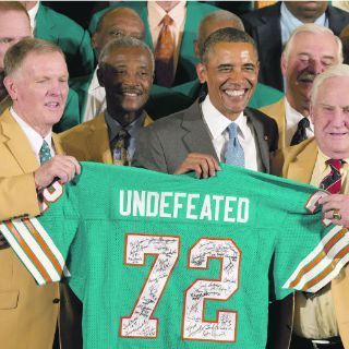 WASHINGTON, ESTADOS UNIDOS (21/AGO/2013).- Cuatro décadas de haber impuesto un récord que aún persiste en la NFL, al terminar invicto la temporada de 1972, el equipo de Delfines de Miami que logró la hazaña fue recibido ayer por el presidente Barack Obama en la Casa Blanca para ser reconocido.