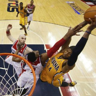 WASHINGTON, ESTADOS UNIDOS (09/MAY/2014).- El buen juego desplegado por los Pacers de Indiana quedó plasmado en el tercer partido de la eliminatoria de semifinal de la Conferencia Este que ganaron a domicilio por 85-63 a los Wizards de Washington.