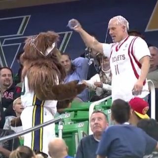 El problema comenzó cuando el "oso" de Utah Jazz por divertir a los presentes, lanzaba serpentinas a algunos distraídos del público, de esto, uno de estos alcanzó a el vaso de cerveza de un par de fanáticos de los Rockets provocando la molestia de estos.