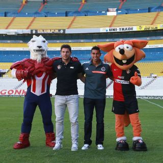 Leandro Cufré y Patricio Araujo posaron para la foto junto a las mascotas del Atlas y de las Chivas;hablaron uno al lado del otro e hicieron un llamado para erradicar los actos violentos en el partido de este sábado.