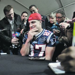 ESTADOS UNIDOS (02/FEB/2012).- Se ha hablado de más del tobillo izquierdo del ala cerrada de los Patriotas de Nueva Inglaterra, Rob Gronkowski.