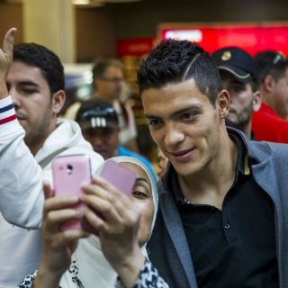 MADRID, ESPAÑA (15/AGO/2014).- El delantero mexicano Raúl Jiménez, último fichaje del Atlético de Madrid, pasó el reconocimiento médico en la clínica Fremap de Majadahonda tras aterrizar en la capital de España.