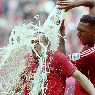 MUNICH, ALEMANIA (14/MAY/2013).- Un festejo inocente ha desatado polémica en Alemania. El jugador del Bayern Munich, Jerome Boateng, al momento de festejar el título de liga de su equipo, tomó un vaso de cerveza y lo roció en la cabeza de su compañero Frank Ribéry.