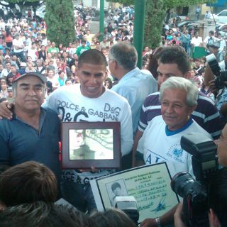 OCOTLÁN, JALISCO (16/JUL/2010).- La plaza principal de Ocotlán lució atiborrada de personas que ansiosas querían a como diera lugar, un autógrafo de su ídolo Carlos Salcido, a quien el gobierno de éste lugar le rindió un reconocimiento a su carrera profesional y al mismo tiempo, la liga de futbol local para niños que lleva su nombre, le entregó un diploma.