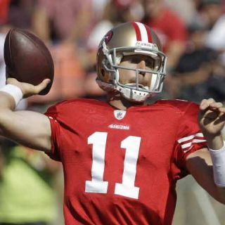 SAN FRANCISCO, CALIFORNIA (09/OCT/2011).- Alex Smith lanzó el domingo dos de sus tres pases de touchdown a Vernon Davis, Frank Gore corrió para anotar en su segundo partido seguido de 100 yardas por tierra y los 49ers de San Francisco vencieron 48-3 a los Bucaneros de Tampa Bay en su mejor arranque en nueve años.