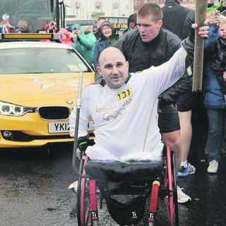 BLACKPOOL, INGLATERRA (23/JUN/2012).- El sargento Rick Clement ascendió por Dickson Road el viernes, con la Antorcha Olímpica pegada al costado de su silla de ruedas y el fuego intacto a pesar de la lluvia.