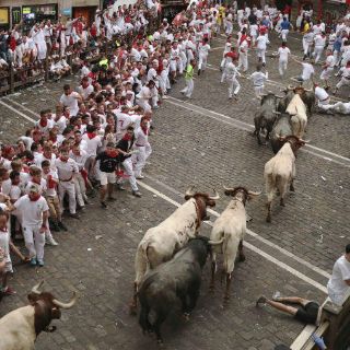 Con cuatro toros por delante y el quinto algo más rezagado, en la parte central de la calle Estafeta se han vivido momentos de peligro máximo, también con caídas de los mozos, pero sin que los toros hayan llegado a alcanzar a ninguno de ellos en estos tramos.
