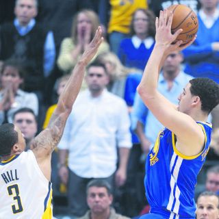 Klay Thompson encestó un tiro a casi seis metros de la canasta, con sólo seis segundos en el reloj de juego, para que los Warriors de Golden State derrotaran agónicamente a los Pacers de Indiana 98-96, propinándoles, de esta forma, a penas su cuarta derrota en casa en esta temporada.