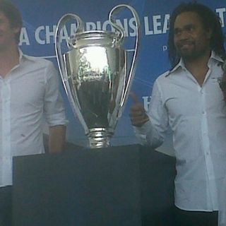 El trofeo viene acompañado por el ex arquero del Manchester United, Edwin van der Sar, y el doble ganador de la Champions con el Real Madrid, Christian Karembeu.