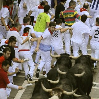 Tras intentar arremeter contra un grupo, el toro rebasó limpiamente la famosa curva de "Estafeta" y posteriormente se unió al resto de guías que le acompañaron con el resto.
