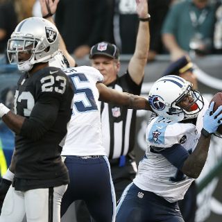 OAKLAND, CALIFORNIA (24/NOV/2013).- Ryan Fitzpatrick lanzó un pase de 10 yardas para una anotación de Kendall Wright con 10 segundos en el reloj, lo que coronó un desempeño impecable que puso el domingo a los Titanes de Tennessee de nuevo en la lucha por los playoffs, al vencer 23-19 a los Raiders de Oakland.