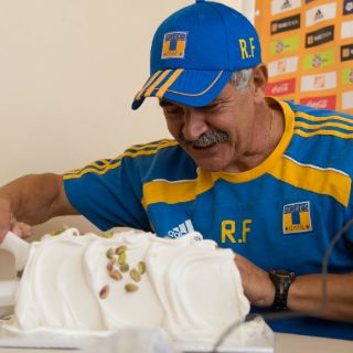 MONTERREY, NUEVO LEÓN (25/FEB/2013).- El brasileño Ricardo 'Tuca' Ferretti, técnico del Tigres, equipo que lidera invicto el torneo Clausura mexicano, dejó atrás las formalidades para bromear y compartir su torta de cumpleaños con periodistas.