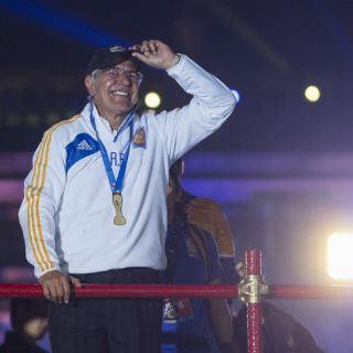 Con un semblante feliz después de haber derrotado al América en penales, el “Tuca” salió a festejar su cuarto trofeo de liga con Tigres, tras los obtenidos en el Apertura 2001, Apertura 2015 y Apertura 2016.