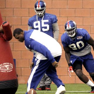 EAST RUTHERFORD, NUEVA JERSEY (28/ENE/2012).- La defensa de los Gigantes de Nueva York empieza por la línea de golpeo.