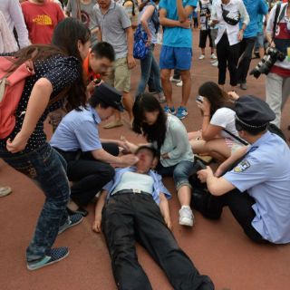 SHANGHAI, CHINA (20/JUN/2013).- Al menos cinco personas han resultado heridas hoy en una estampida provocada por un millar de personas concentradas en el estadio de futbol de la prestigiosa Universidad de Tongji, en Shanghái (este de China), durante una visita del exfutbolista inglés David Beckham.