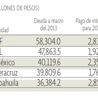 En montos netos, los estados más endeudados son aquellos que pagarán más dinero por intereses: Distrito Federal, Nuevo León, Estado de México, Veracruz y Coahuila, los cuales pagarán entre 1,923.4 y 2,857.2 millones de pesos.